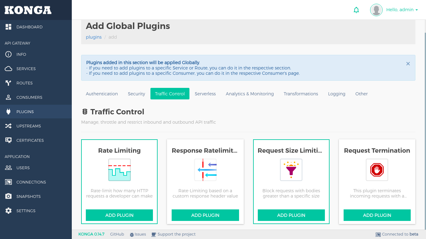 在请求到达kong之后,转发给后端应用之前,你可以应用kong自带的插件对请求进行处理,合法认证,限流控制,黑白名单校验,日志采集等等。同时,你也可以按照kong的教程文档,定制开发属于自己的插件。