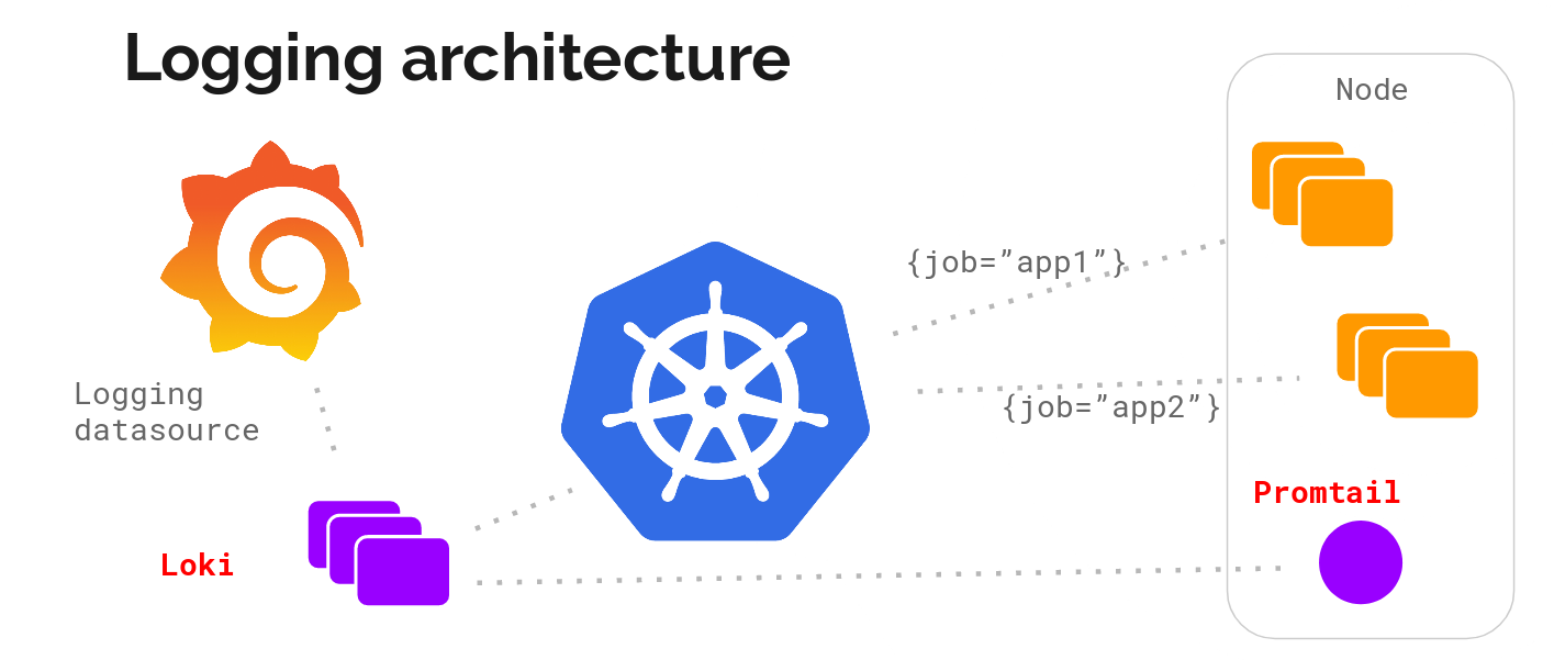 不难看出,Loki的架构非常简单,使用了和prometheus一样的标签来作为索引,也就是说,你通过这些标签既可以查询日志的内容也可以查询到监控的数据,不但减少了两种查询之间的切换成本,也极大地降低了日志索引的存储。 Loki将使用与prometheus相同的服务发现和标签重新标记库,编写了pormtail, 在k8s中promtail以daemonset方式运行在每个节点中,通过kubernetes api等到日志的正确元数据,并将它们发送到Loki。