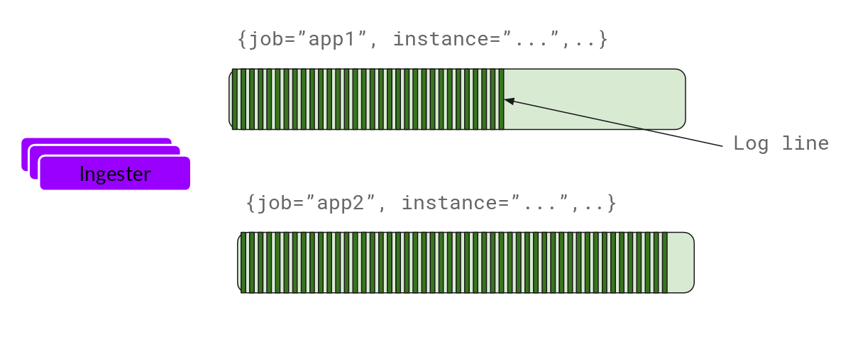 Loki通过构建压缩数据块来实现这一点,方法是在日志进入时对其进行gzip操作,组件ingester是一个有状态的组件,负责构建和刷新chunck,当chunk达到一定的数量或者时间后,刷新到存储中去。每个流的日志对应一个ingester,当日志到达Distributor后,根据元数据和hash算法计算出应该到哪个ingester上面。