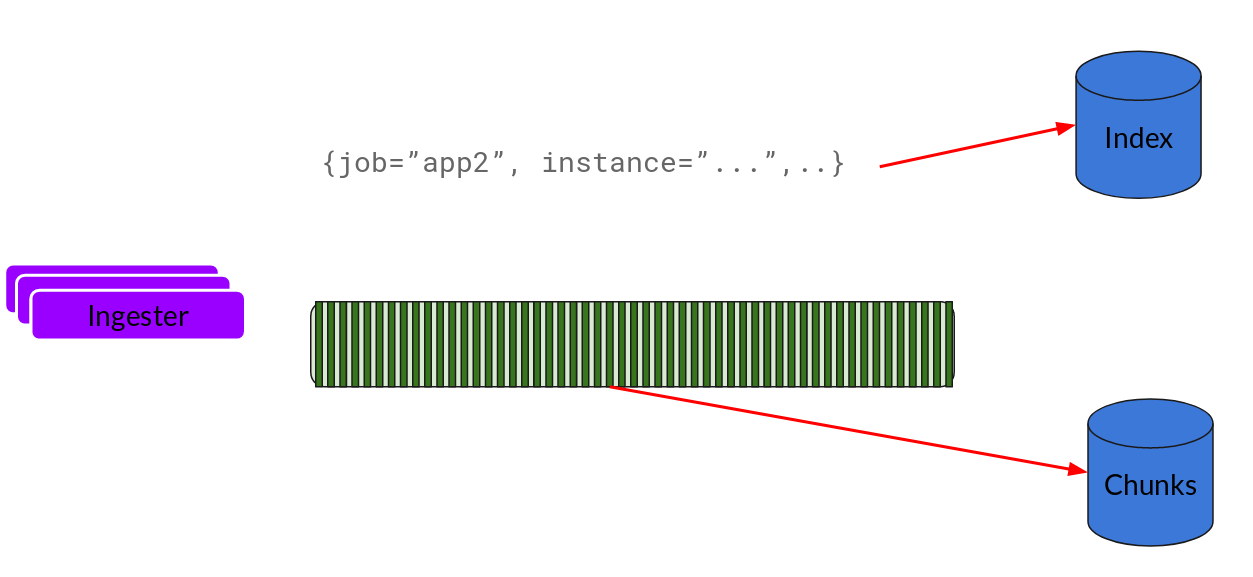 基本上就是将日志进行压缩并附加到chunk上面。一旦chunk“填满”(数据达到一定数量或者过了一定期限),ingester将其刷新到数据库。我们对块和索引使用单独的数据库,因为它们存储的数据类型不同。