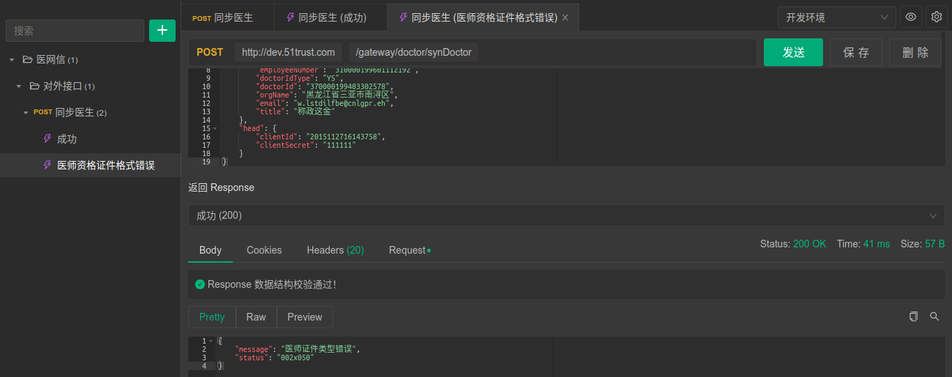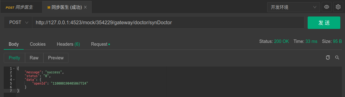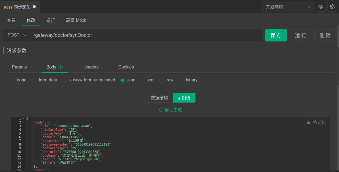 这个视图就比较熟悉了,页面布局和postman基本一致,不同的是,body不需要再一个一个的添加了,可以根据之前写好的参数信息一键生成,是不是非常的方便。
