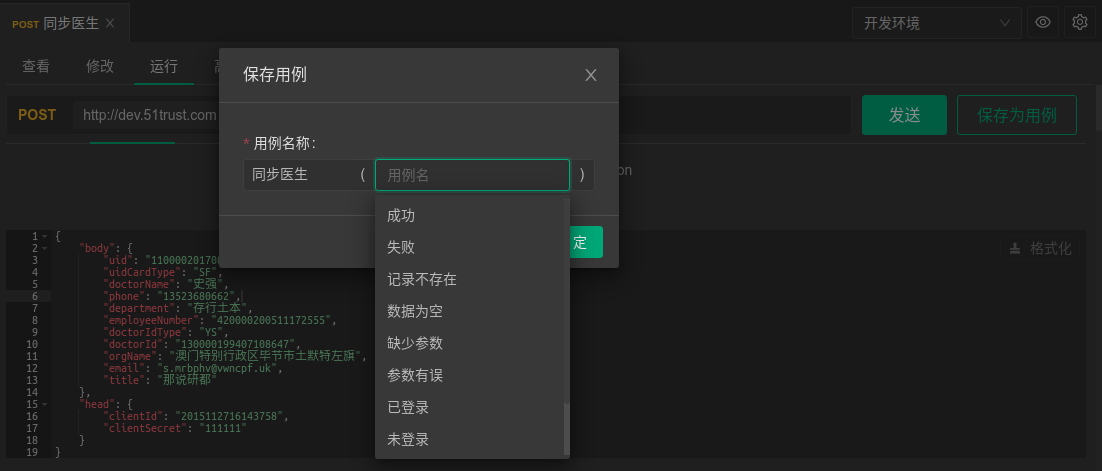 调试成功后还可以保存成用例,方便以后使用。点击“保存”按钮,可以选择用例的名称,这里设计的非常贴心