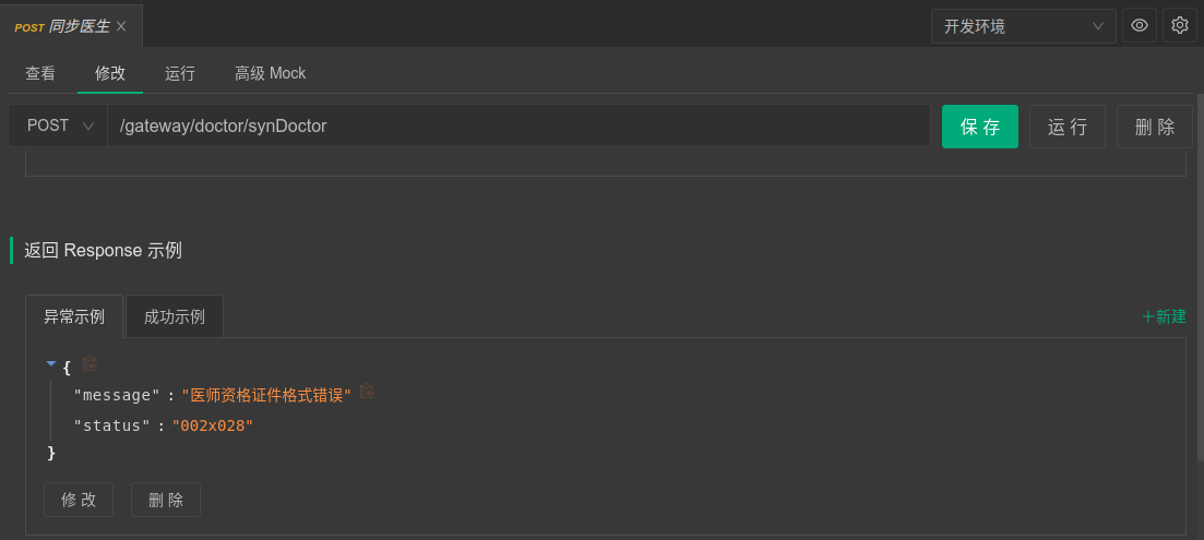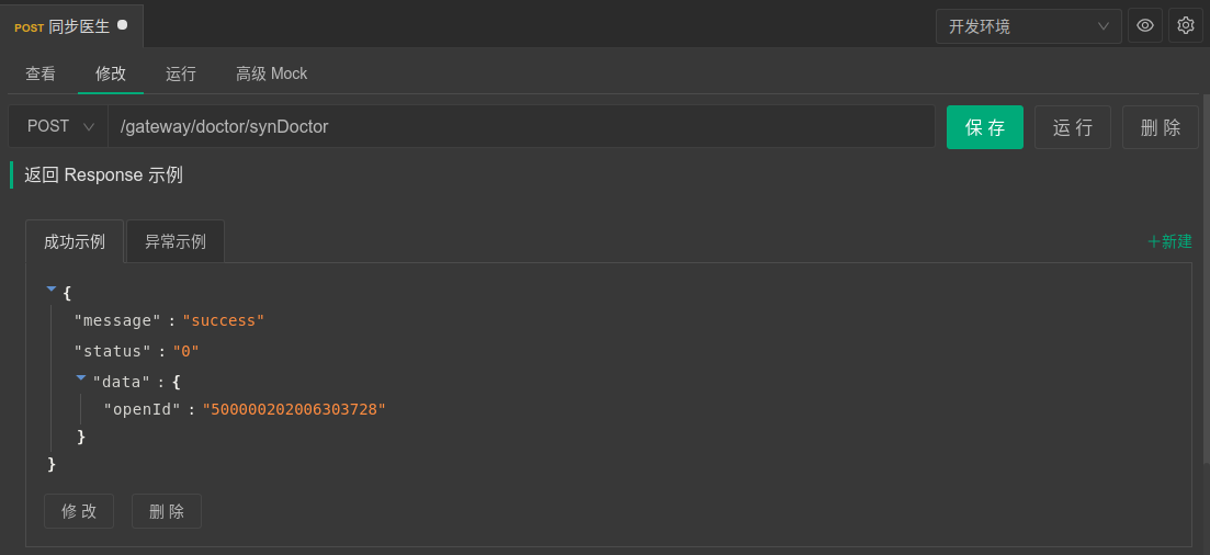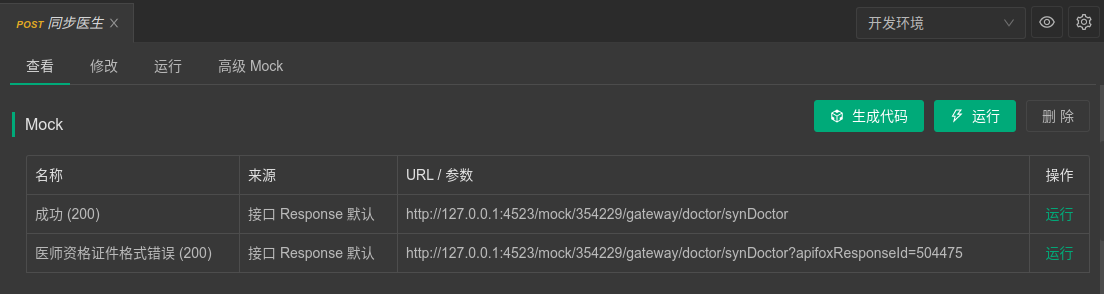 这里是返回值的配置,主要用于提供mock服务,方便前端调试。当然也用于生成文档。这里可以添加多个,包括成功的,和各种错误返回的情况