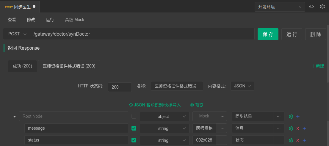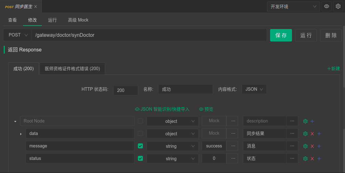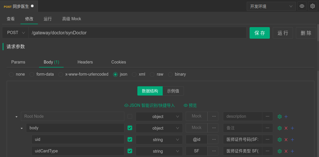 这是请求参数,这里和Postman就比较类似了,但是做了一些优化,比如这里可以一个属性一个属性的添加,也可以直接把写好的json结构直接导入,另外这里还可以设置mock规则,方便测试,同时还可以添加备注信息,也是为了生成文档的需要。