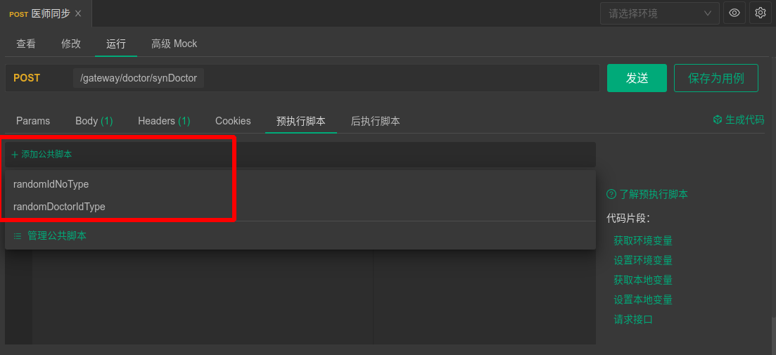 有时我们需要在运行接口前做一些准备工作,或者在接口执行完成后做一些验证工作,这个和postman一样,Apifox也是支持的,只是Apifox又向前走了一步,因为有一些操作在很多接口都需要做,如果使用postman就需要重复编写很多遍,在Apifox中,我们可以把它作为一个公共脚本提供。这样在任何接口中都可以使用。