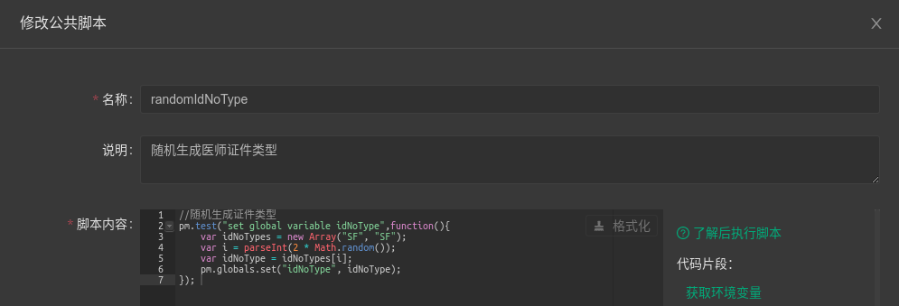 这里着重讲一下测试数据的生成,这个功能对于测试人员非常有帮助,没有mock数据功能之前,我们要么手工构造测试数据,效率非常低;要么通过预执行脚本设置全局或这环境变量,然后在接口数据中引用,成本也比较高,而且对测试人员的要求很高,需要会js脚本。