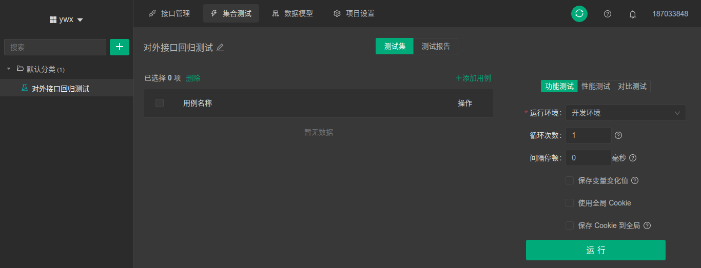 当有很多的接口需要测试时,一个一个的点击运行显然是不合适的,Apifox提供了批量执行测试用例的能力