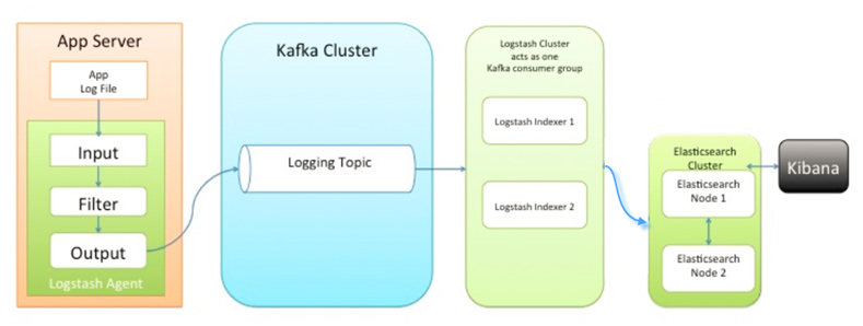 第二种架构,引入了消息队列机制,位于各个节点上的Logstash Agent先将数据/日志传递给Kafka(或者Redis),并将队列中消息或数据间接传递给Logstash,Logstash过滤、分析后将数据传递给Elasticsearch存储。最后由Kibana将日志和数据呈现给用户。因为引入了Kafka(或者Redis),所以即使远端Logstash server因故障停止运行,数据将会先被存储下来,从而避免数据丢失。这种架构适合于较大集群的解决方案,但由于Logstash中心节点和Elasticsearch的负荷会比较重,可将他们配置为集群模式,以分担负荷,这种架构的优点在于引入了消息队列机制,均衡了网络传输,从而降低了网络闭塞尤其是丢失数据的可能性,但依然存在Logstash占用系统资源过多的问题。