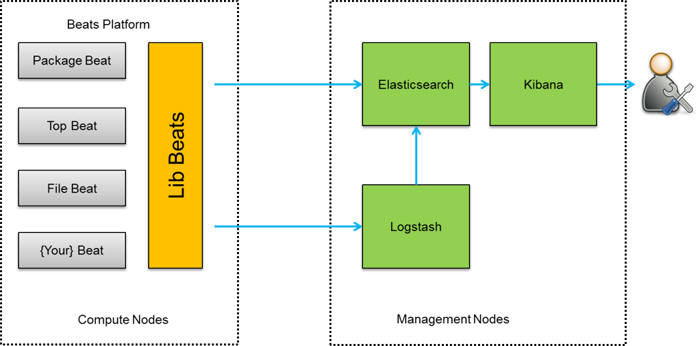 第四种架构,将Logstash-forwarder替换为Beats。经测试,Beats满负荷状态所耗系统资源和Logstash-forwarder相当,但其扩展性和灵活性有很大提高。Beats platform目前包含有Packagebeat、Topbeat和Filebeat三个产品,均为Apache 2.0 License。同时用户可根据需要进行二次开发。这种架构原理基于第三种架构,但是更灵活,扩展性更强。同时可配置Logstash 和Elasticsearch 集群用于支持大集群系统的运维日志数据监控和查询。