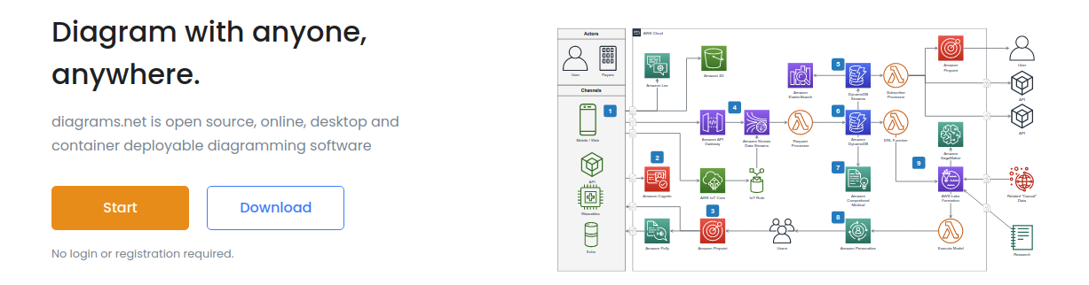draw.io 是一个强大简洁的在线的绘图网站,支持流程图,UML图,架构图,原型图等图标。支持Github,Google Drive, One drive等网盘同步,并且永久免费。如果觉得使用Web版不方便,draw.io 也提供了多平台的离线桌面版可供下载。